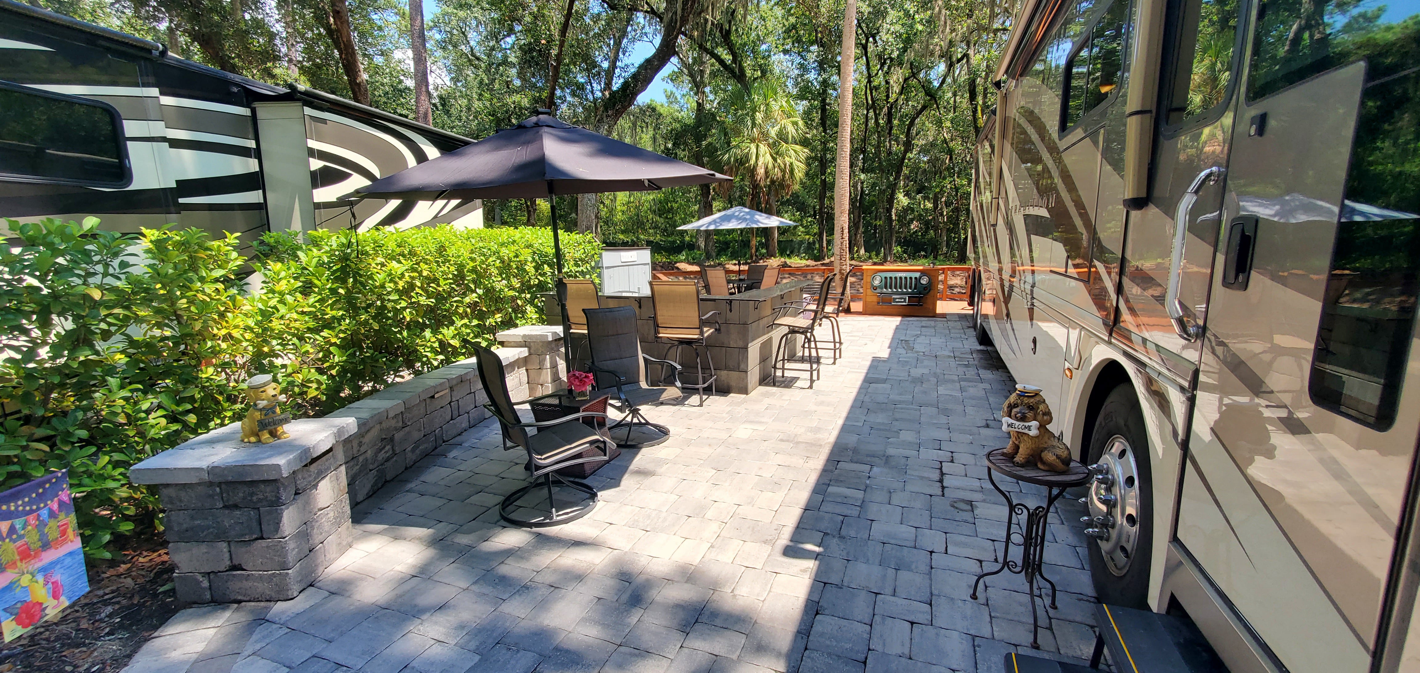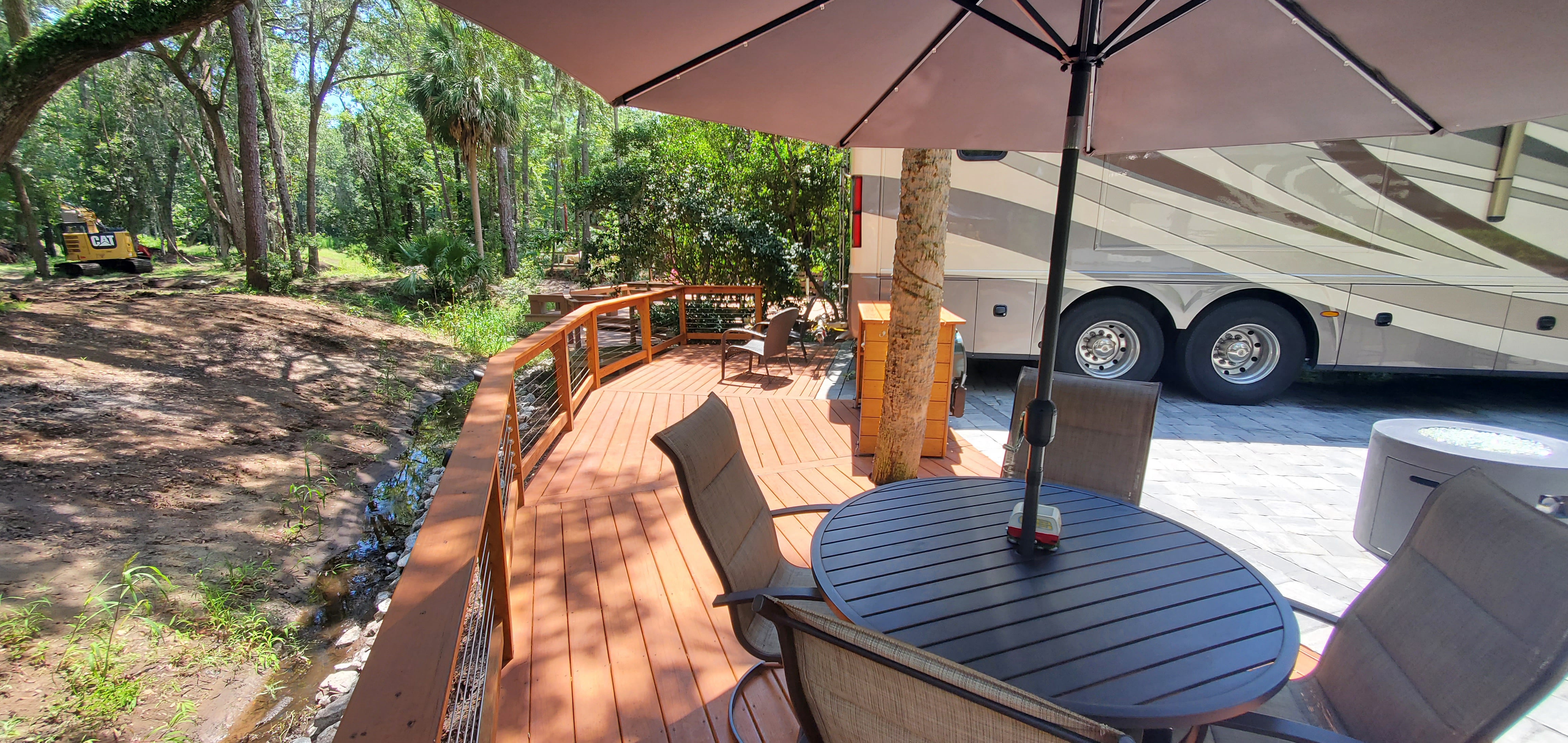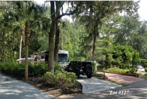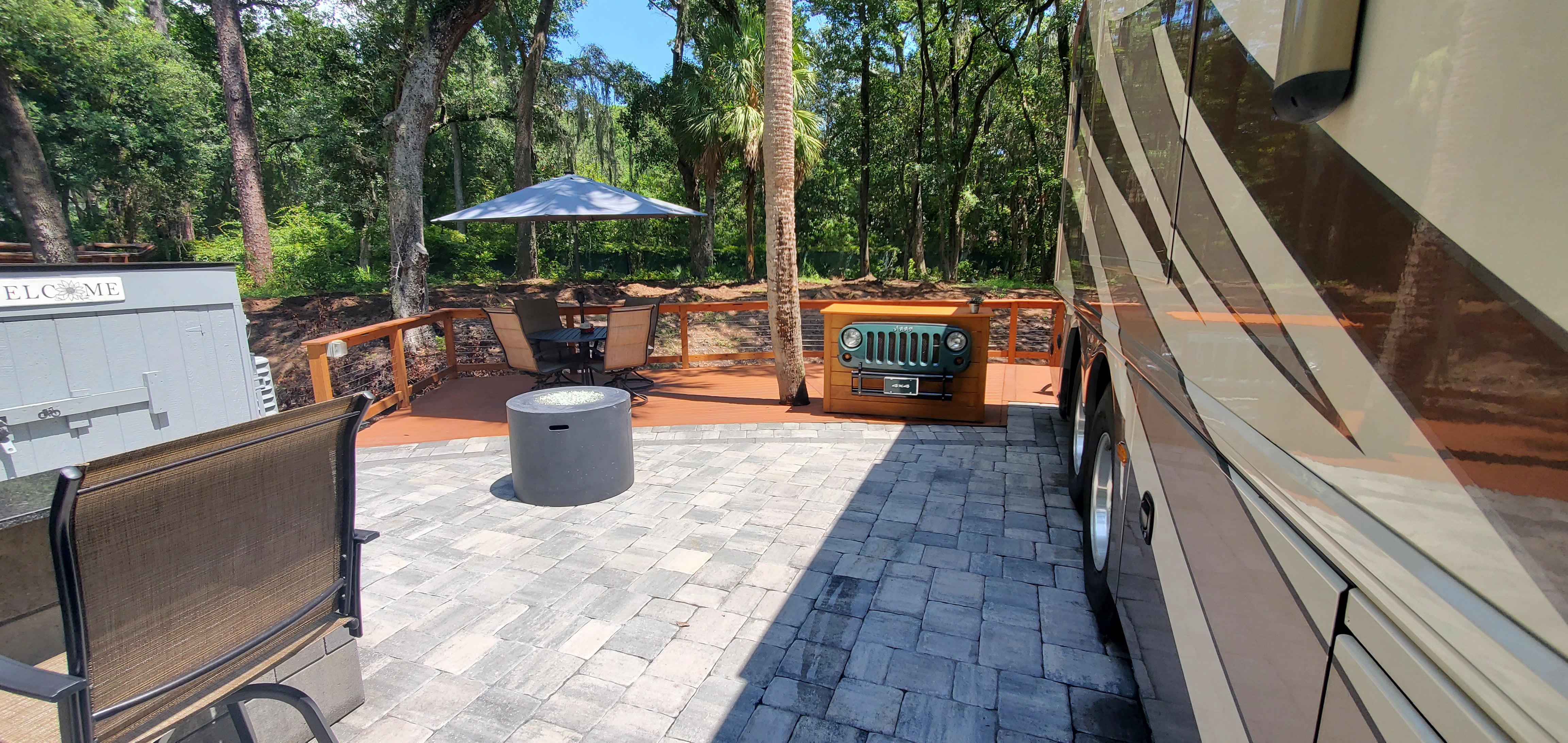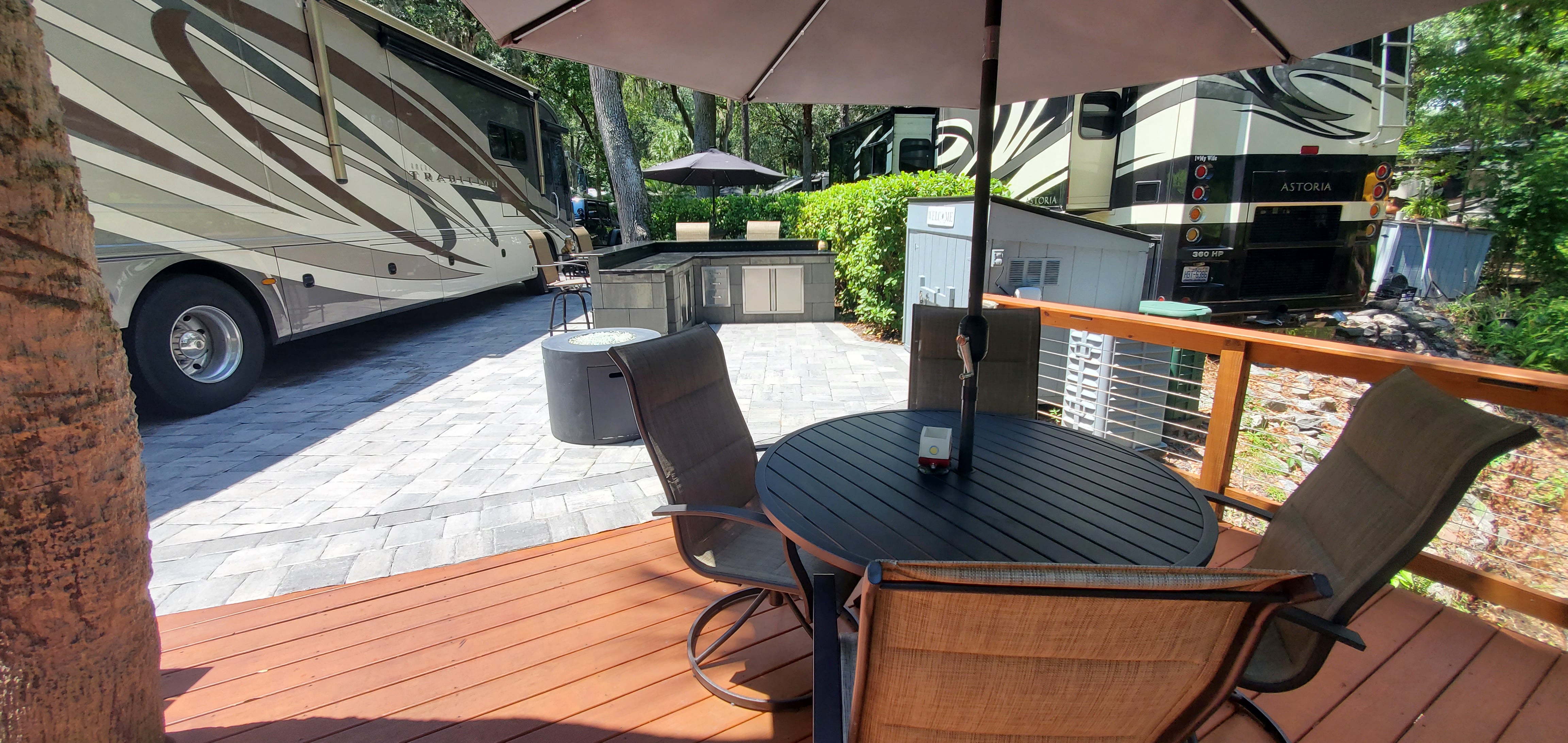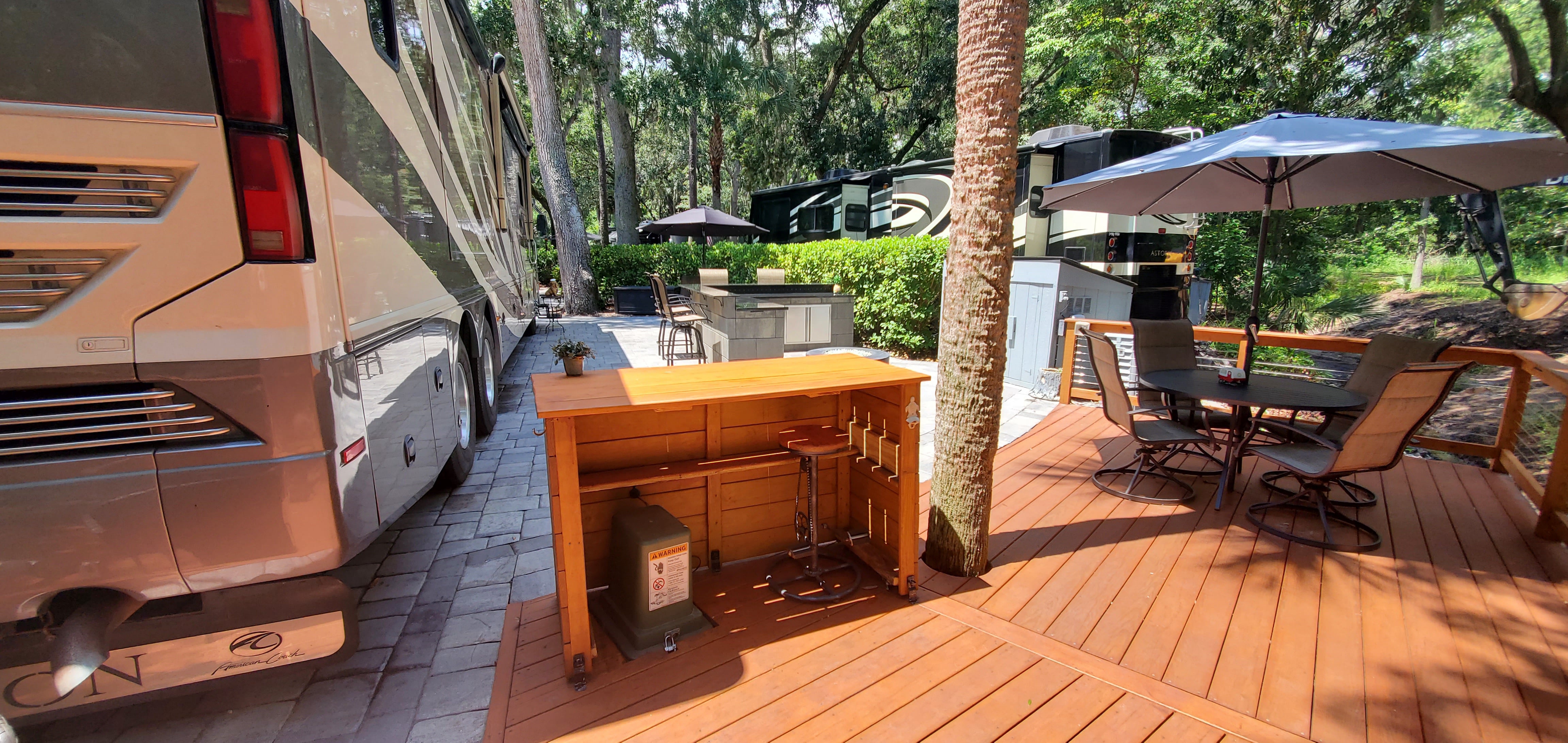 Privacy in the front & Party in the back! Lot 127 has a large paver parking & patio area & a huge deck overlooking a quiet & tranquil natural area that gives an occasional wild life experience. The lot is spacious enough for any coach & is sap free. We have a nice hedge for privacy & resort WiFi works well here. The lot features a gas fire pit with quality furniture & umbrellas, as well as a bar & patio box for storage. The lot has lighting throughout & some “up” lighting for the natural area at night.