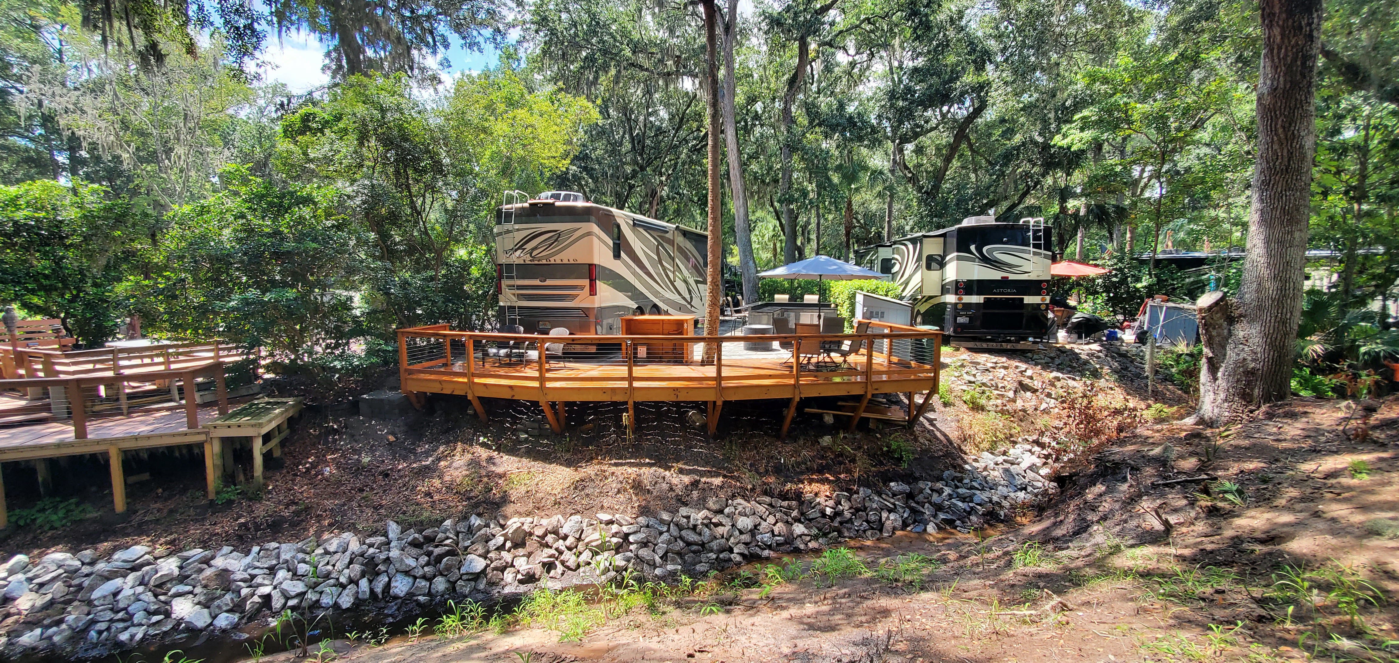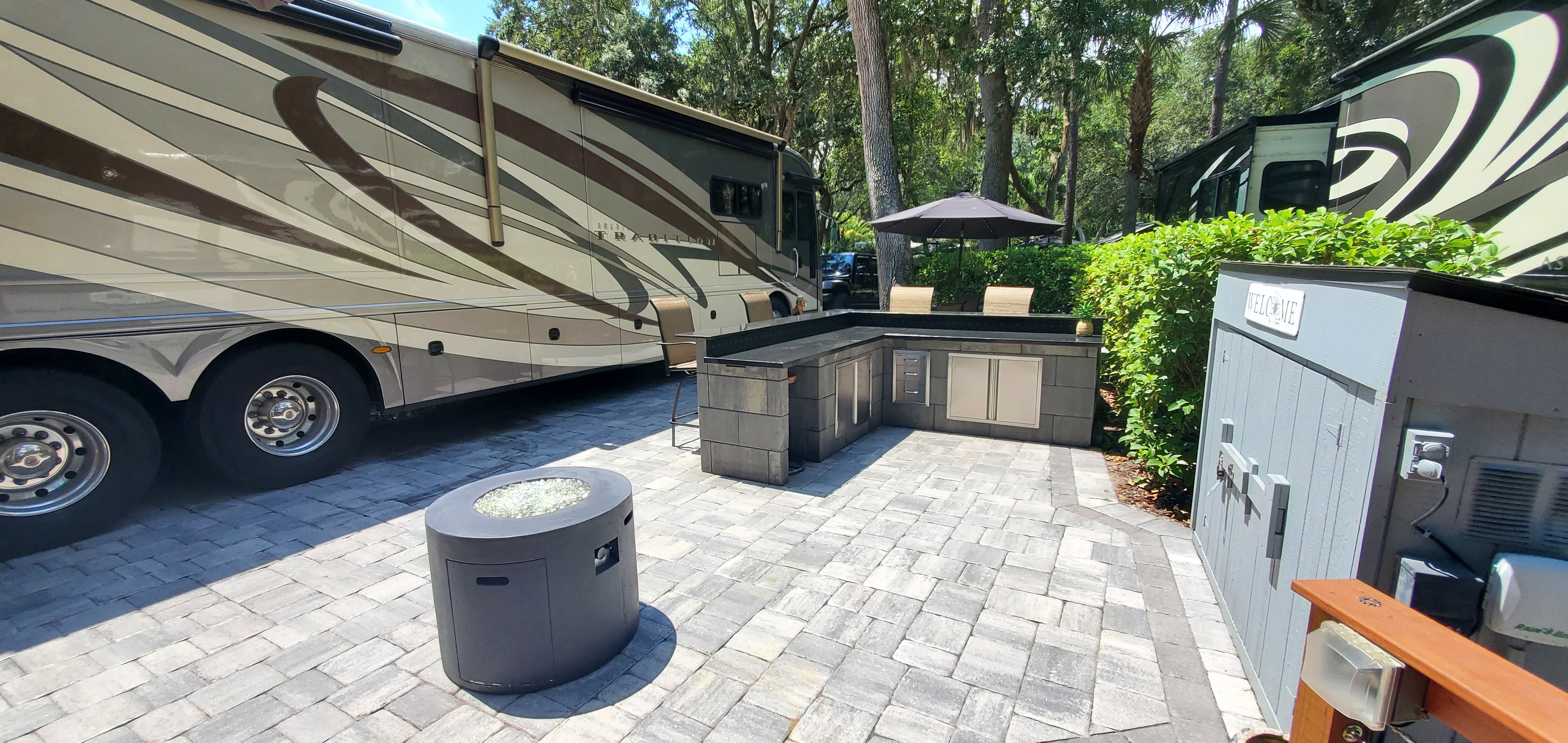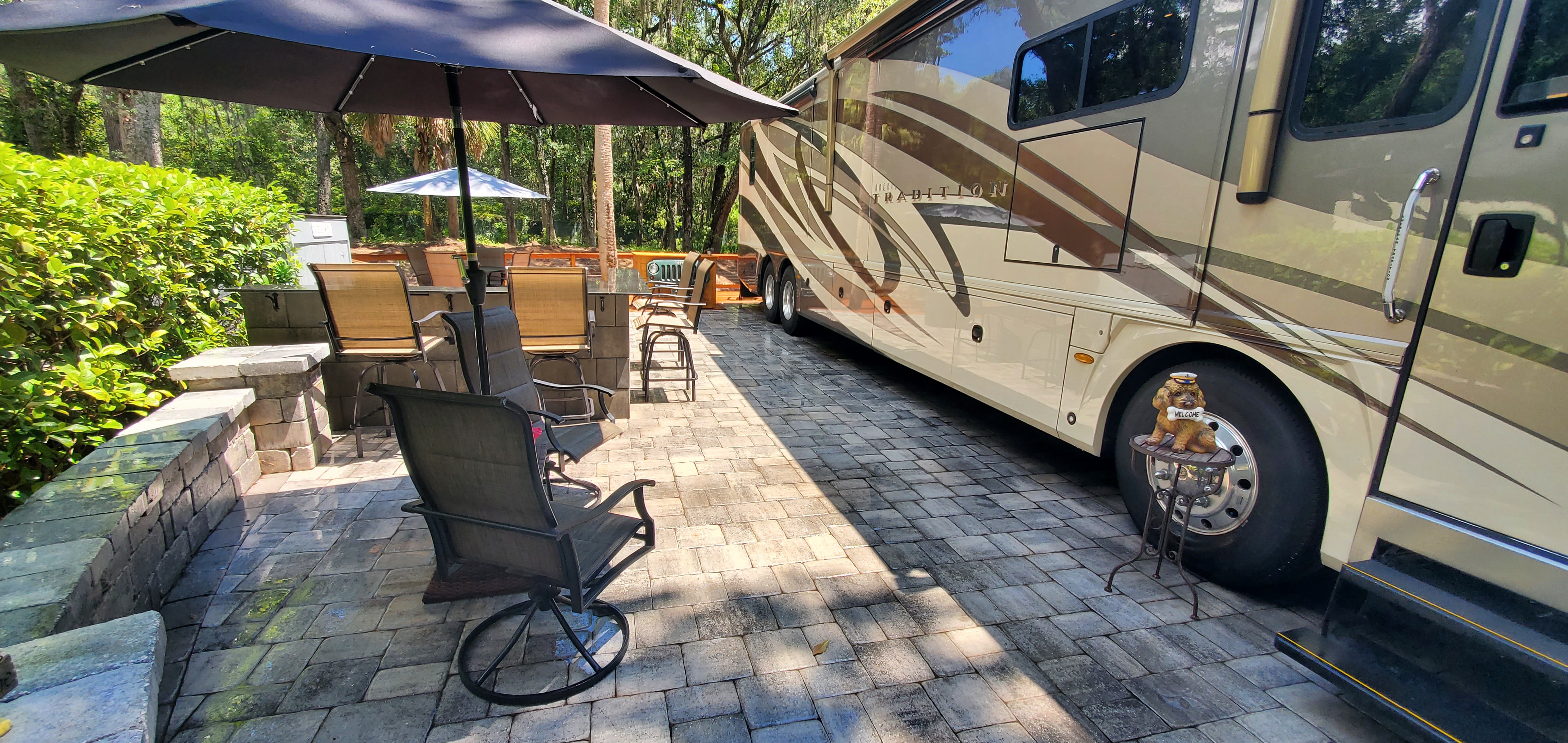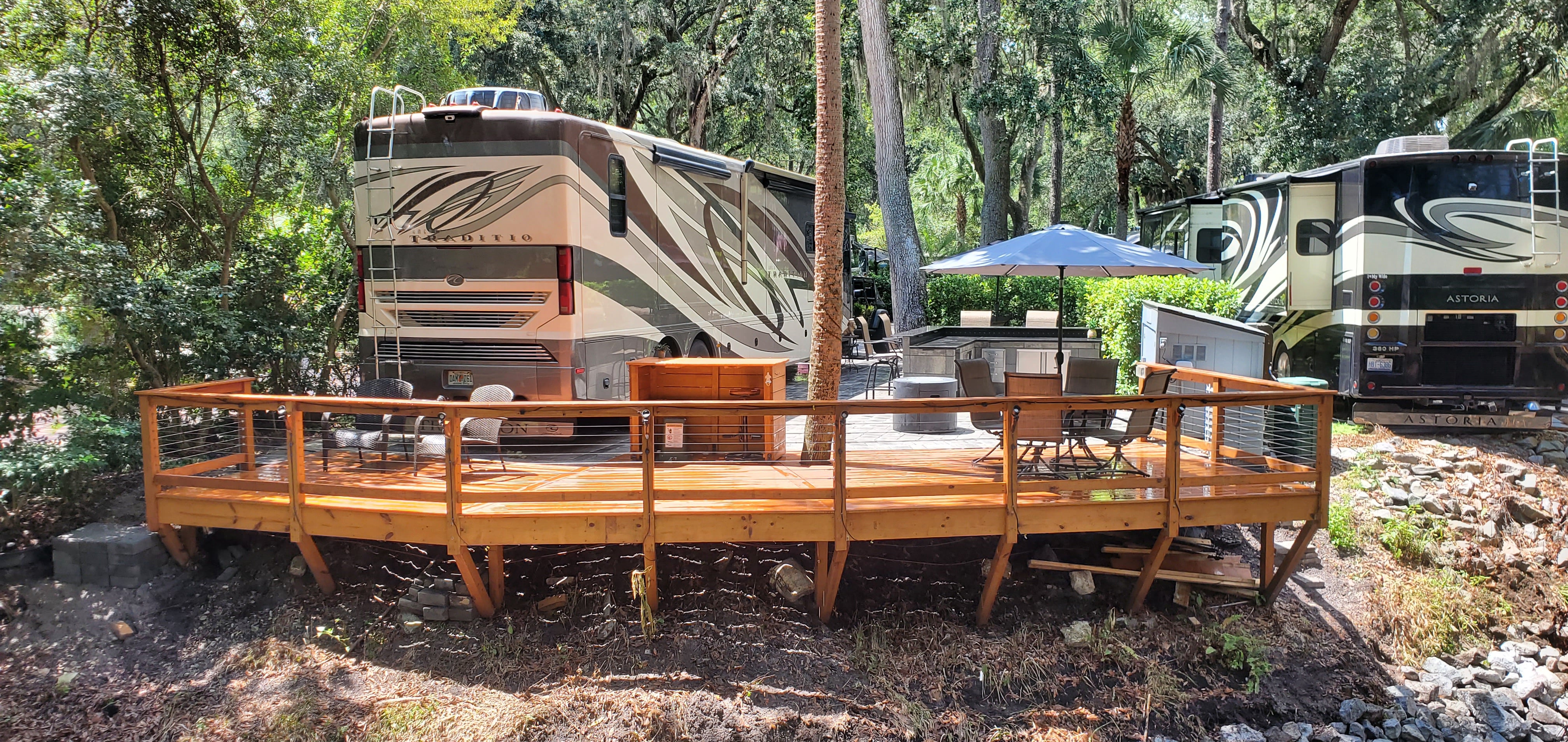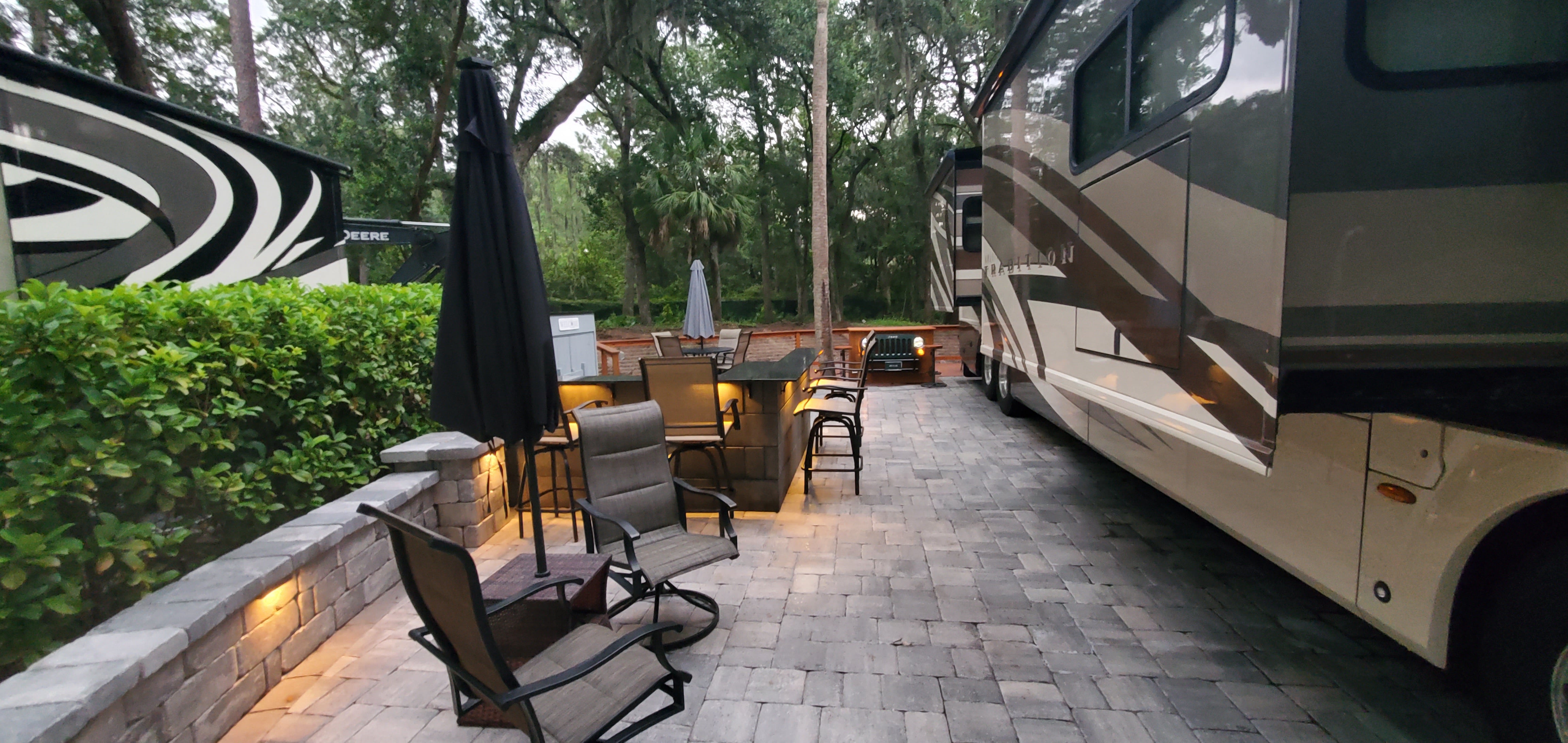 Privacy in the front & Party in the back! Lot 127 has a large paver parking & patio area & a huge deck overlooking a quiet & tranquil natural area that gives an occasional wild life experience. The lot is spacious enough for any coach & is sap free. We have a nice hedge for privacy & resort WiFi works well here. The lot features a gas fire pit with quality furniture & umbrellas, as well as a bar & patio box for storage. The lot has lighting throughout & some “up” lighting for the natural area at night.