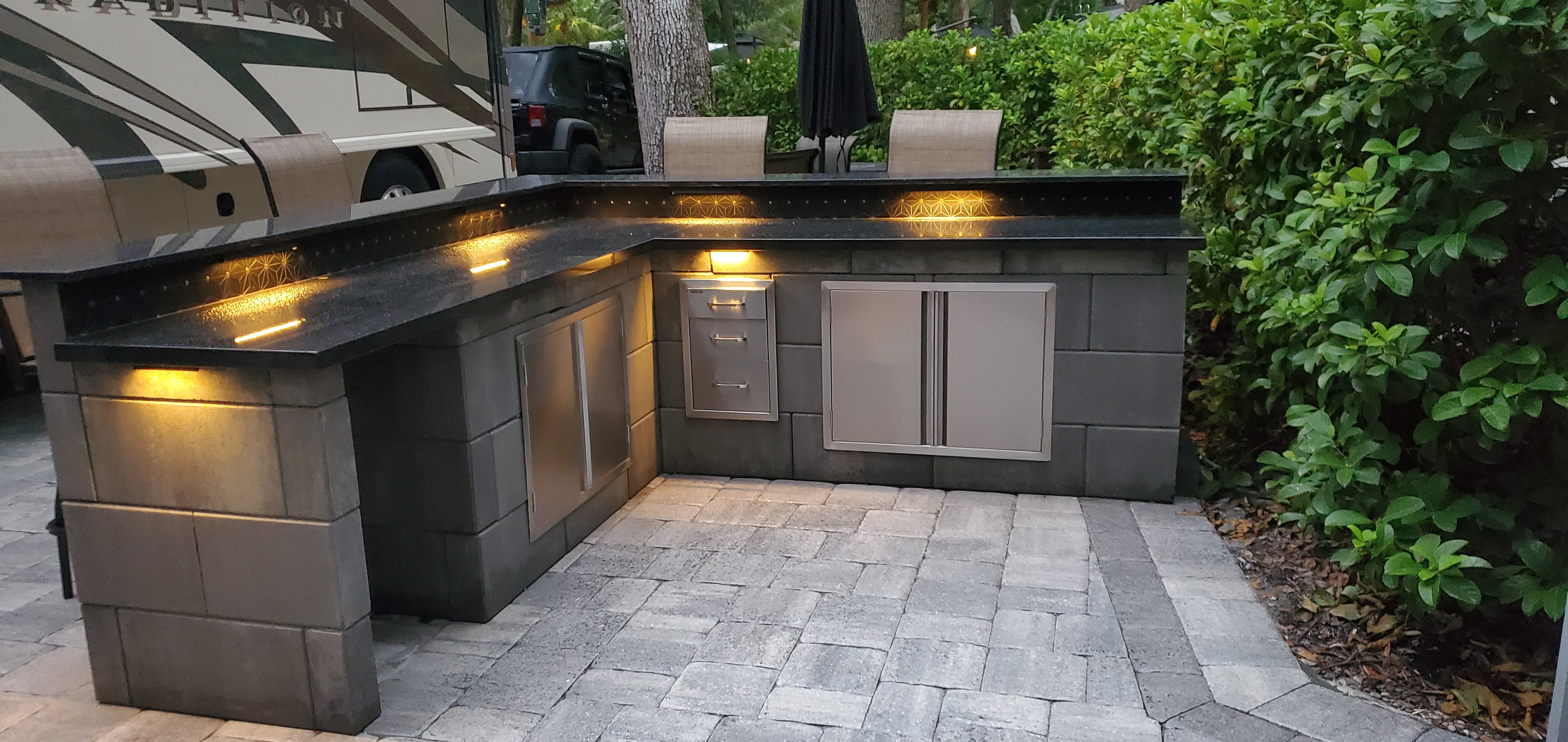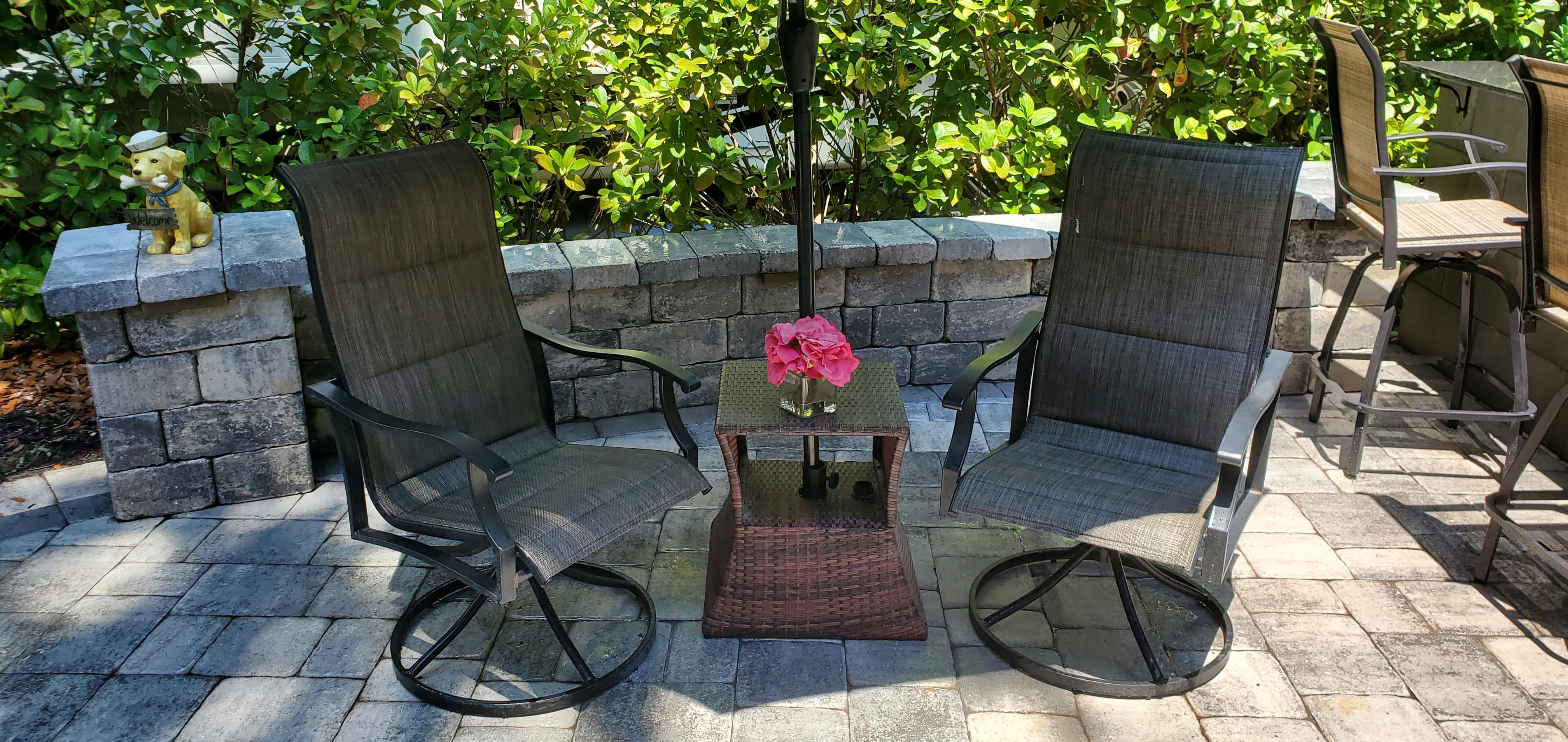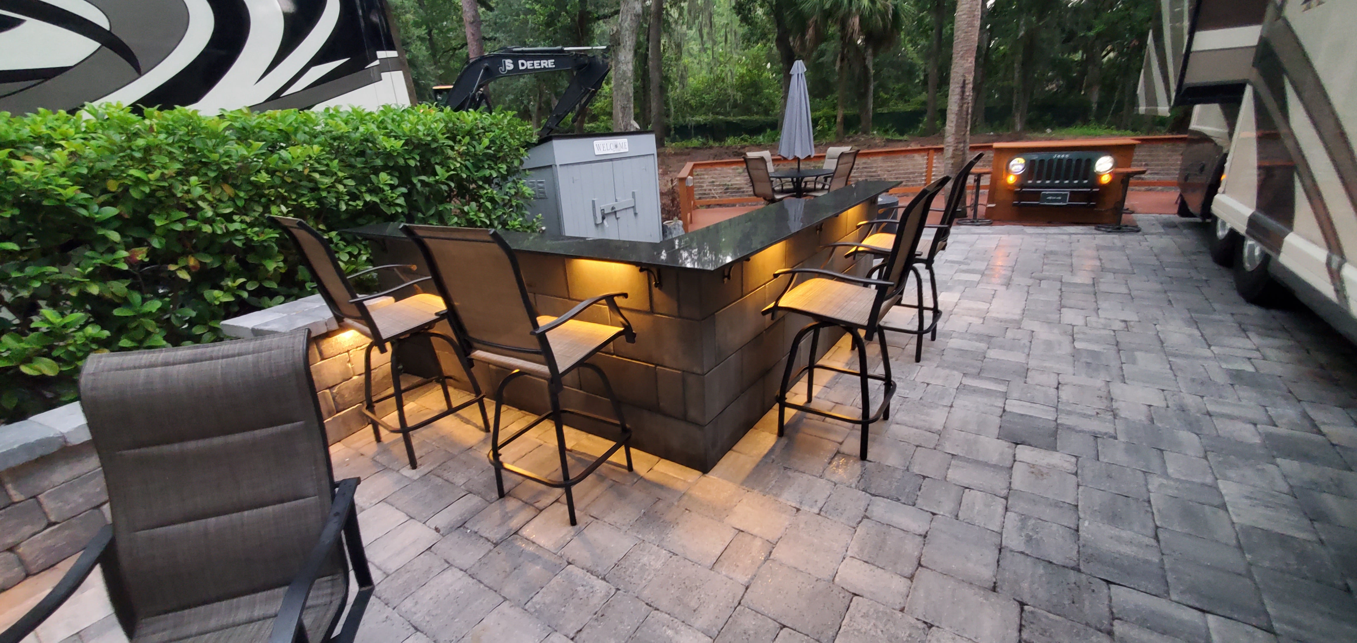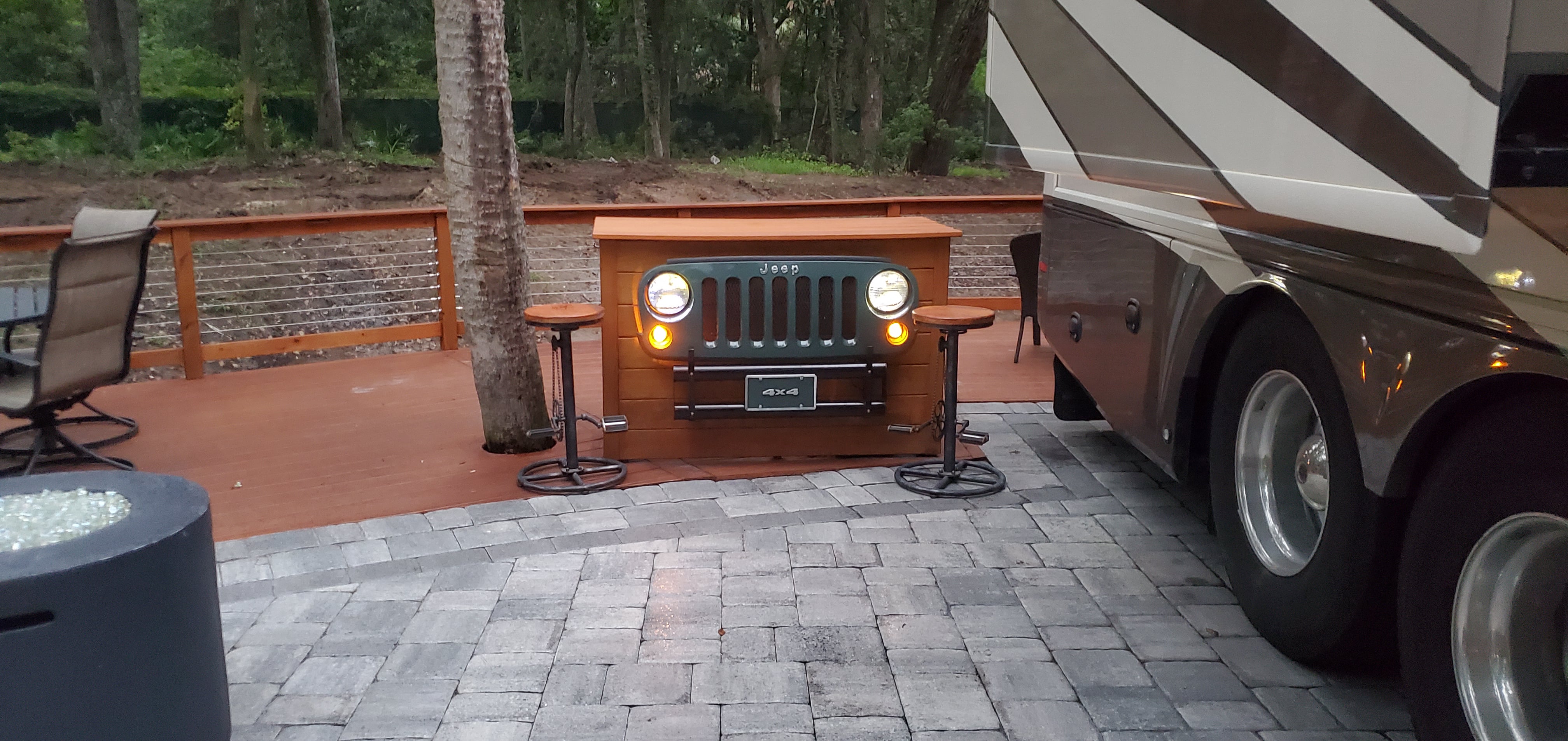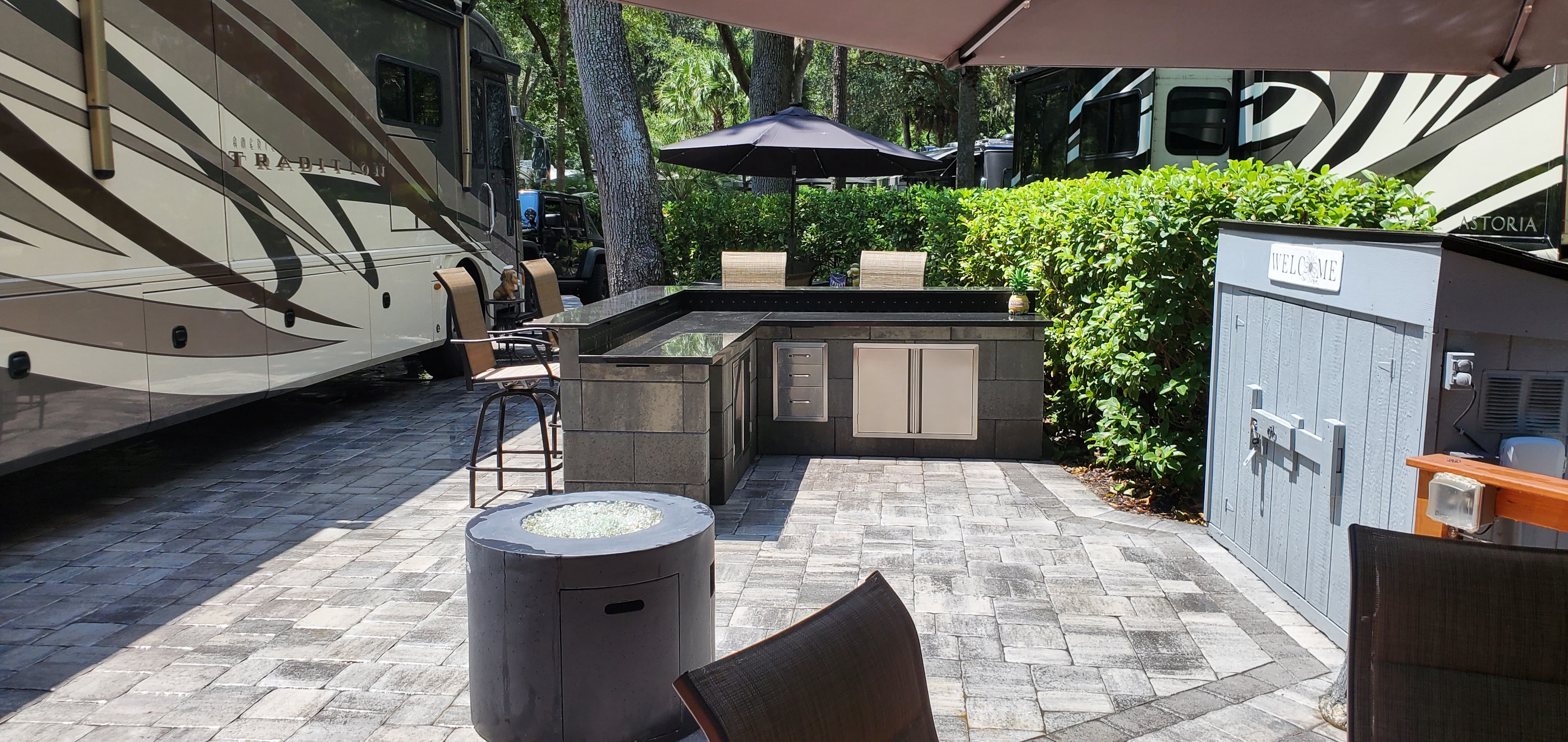 Privacy in the front & Party in the back! Lot 127 has a large paver parking & patio area & a huge deck overlooking a quiet & tranquil natural area that gives an occasional wild life experience. The lot is spacious enough for any coach & is sap free. We have a nice hedge for privacy & resort WiFi works well here. The lot features a gas fire pit with quality furniture & umbrellas, as well as a bar & patio box for storage. The lot has lighting throughout & some “up” lighting for the natural area at night.